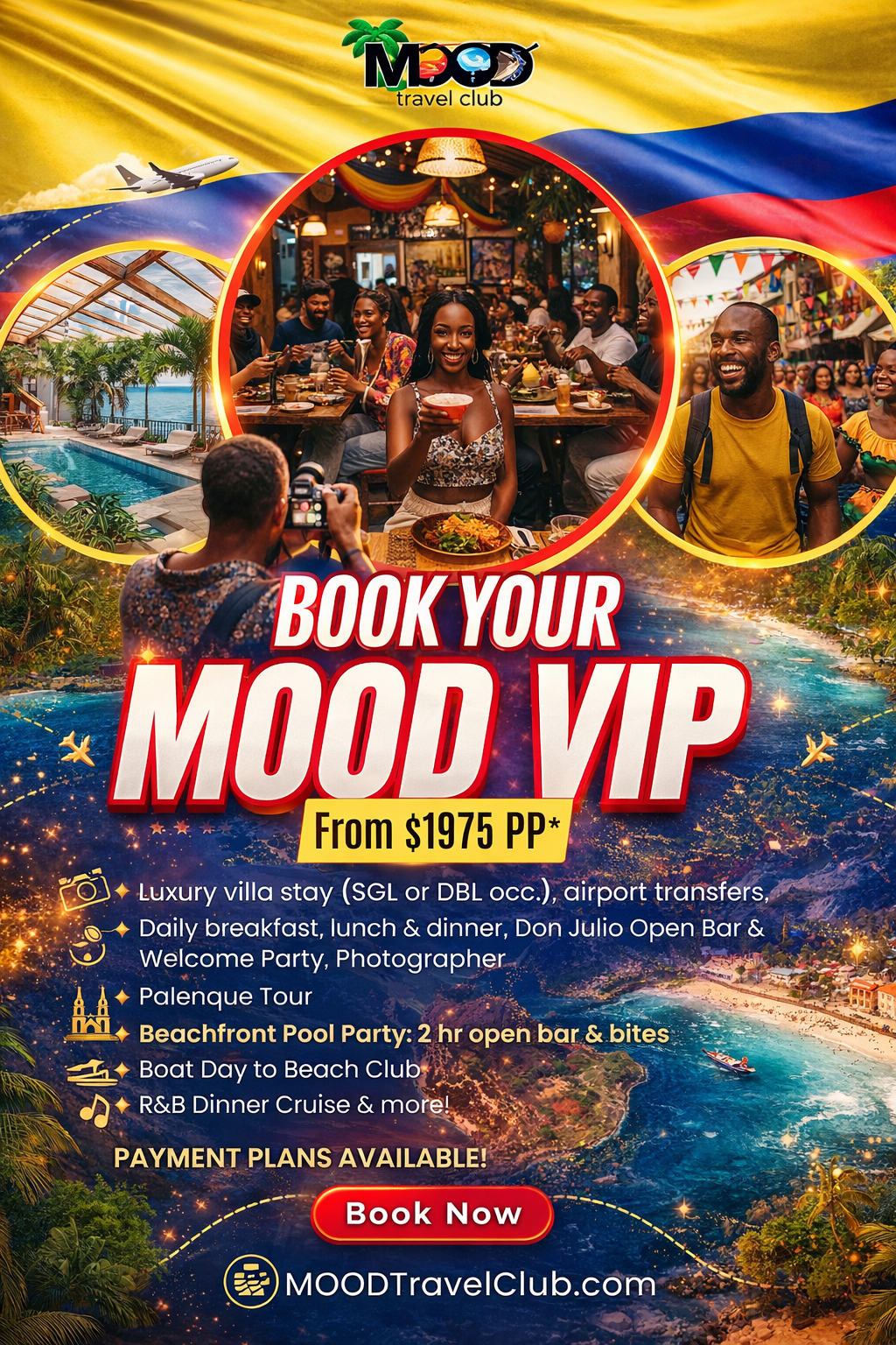Included Tours: Palenque & Boat Day to Rosario Islands | Included Tours: Palenque, Boat Day to Rosario Islands, Beachfront Poolparty: 2 hr Open Bar & bites, R&B Dinner cruise | Included Tours: Palenque, Boat Day to Rosario Islands, Beachfront Poolparty: 2 hr Open Bar & bites, R&B Dinner cruise | ||