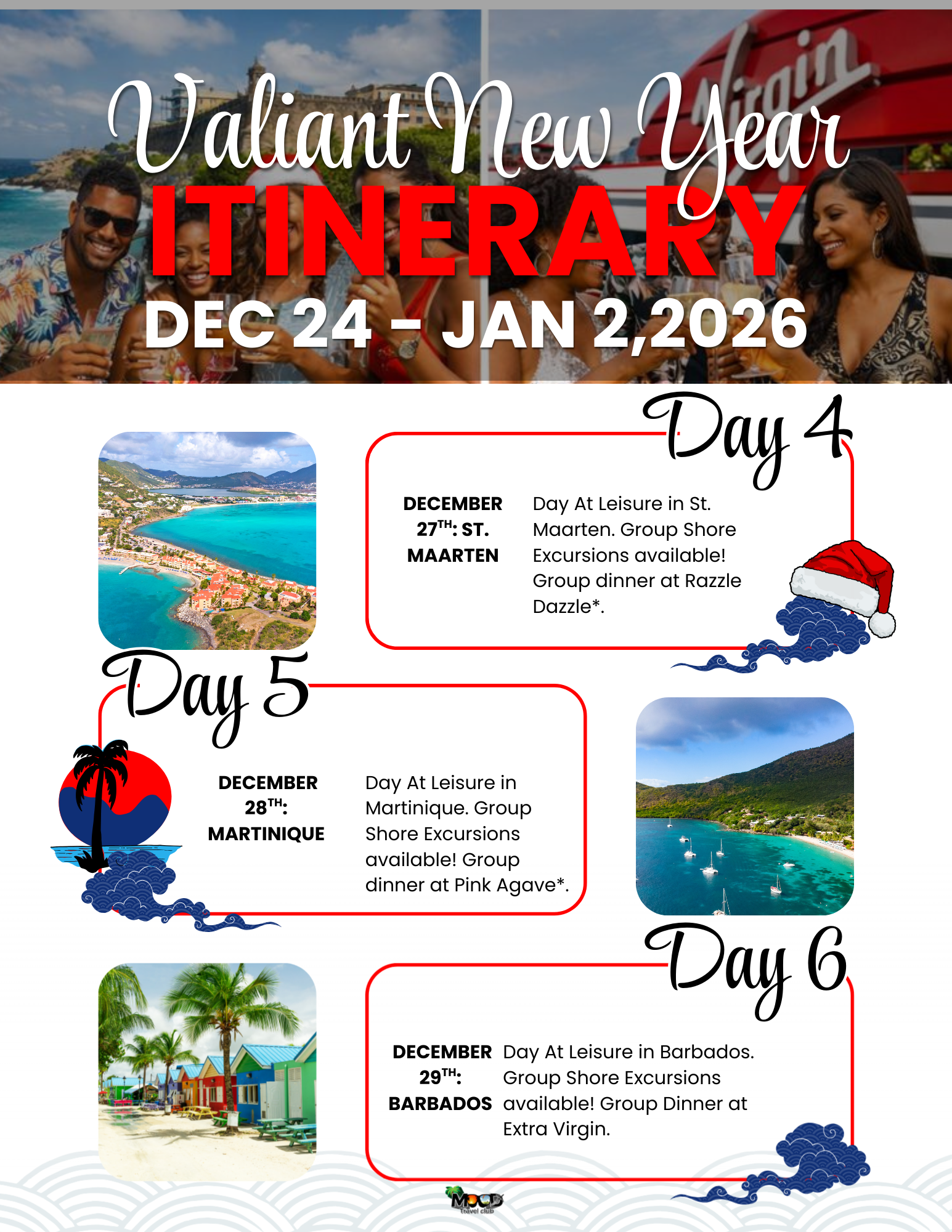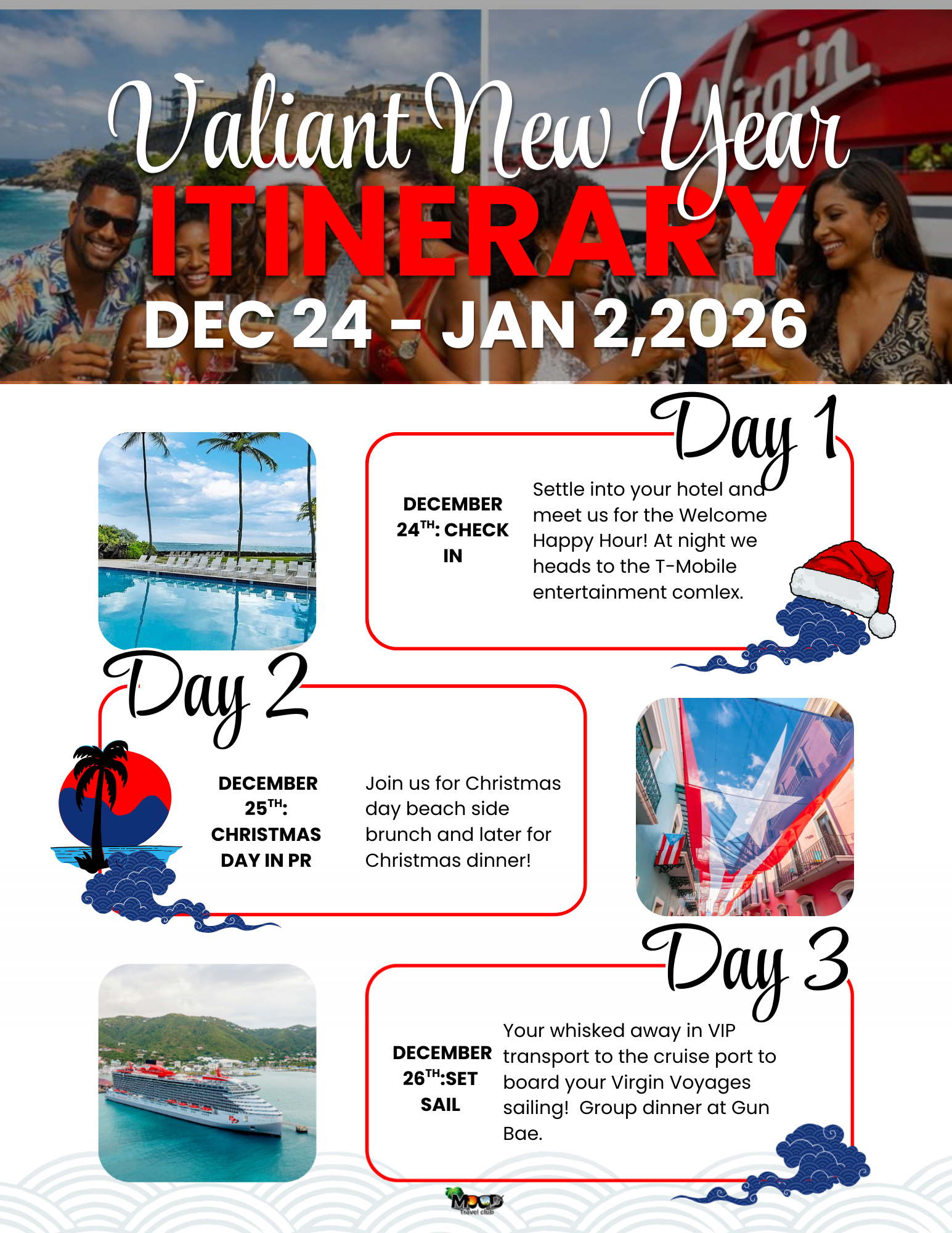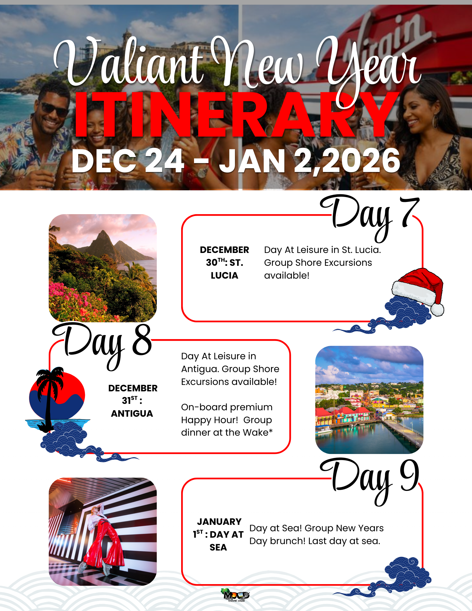 Join MOOD Travel Club in San Juan, Puerto Rico (Dec 24–26), then sail Virgin Voyages (Dec 26–Jan 2) through the Caribbean on the Valiant New Year’s itinerary—complete with curated group moments, optional shore excursions, and a private New Year’s Eve premium open bar hour just for our group.