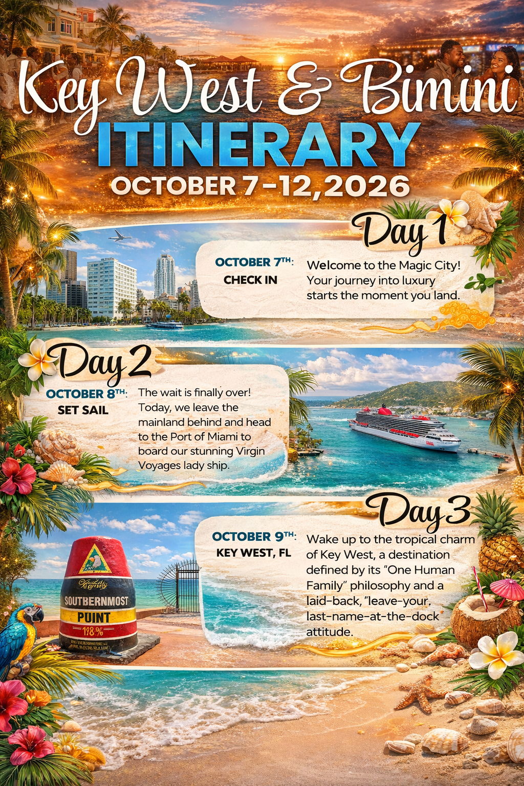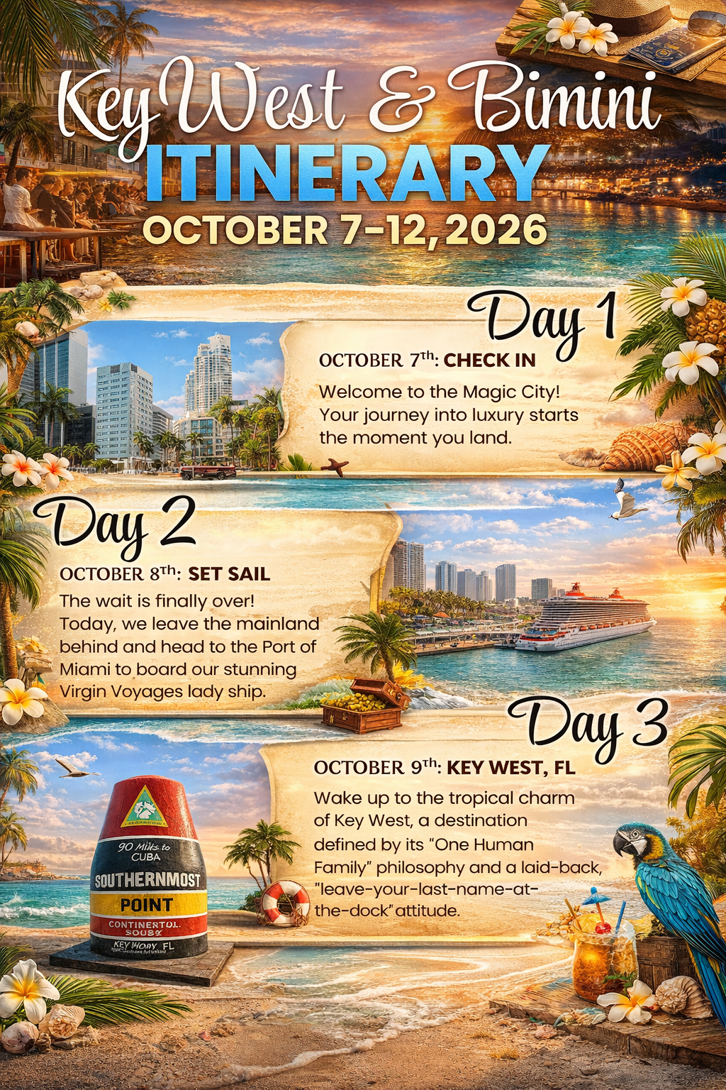 This itinerary offers the perfect balance of American tropical culture and Bahamian luxury. You get a full day to explore the eclectic charm of Key West followed by an exclusive, private island experience in Bimini. It’s a "best of both worlds" trip designed for travelers who want both exploration and relaxation.